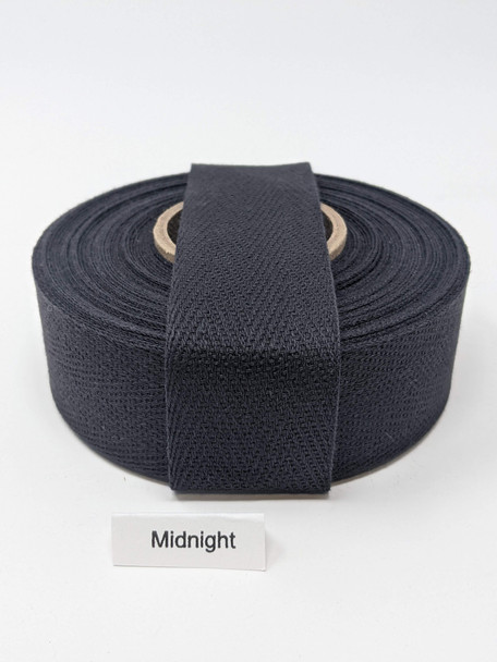 Quick view Cotton Twill Tape 1.25" Midnight Black, 72 yard roll MSRP: Now: $30.40 Was: 100% cotton twill tape, Price is for a full 72 yd roll. Dyed by direct dye, not guaranteed washableMade in USA